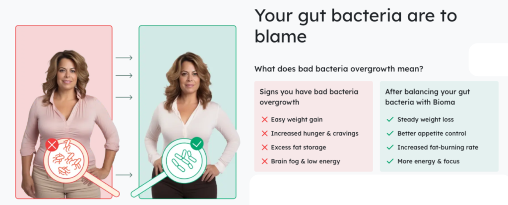 Unlike basic probiotics that only focus on one strain, Bioma offers complete microbiome support, helping rebalance gut flora — which plays a key role in metabolism, nutrient absorption, appetite regulation, and even mental health.